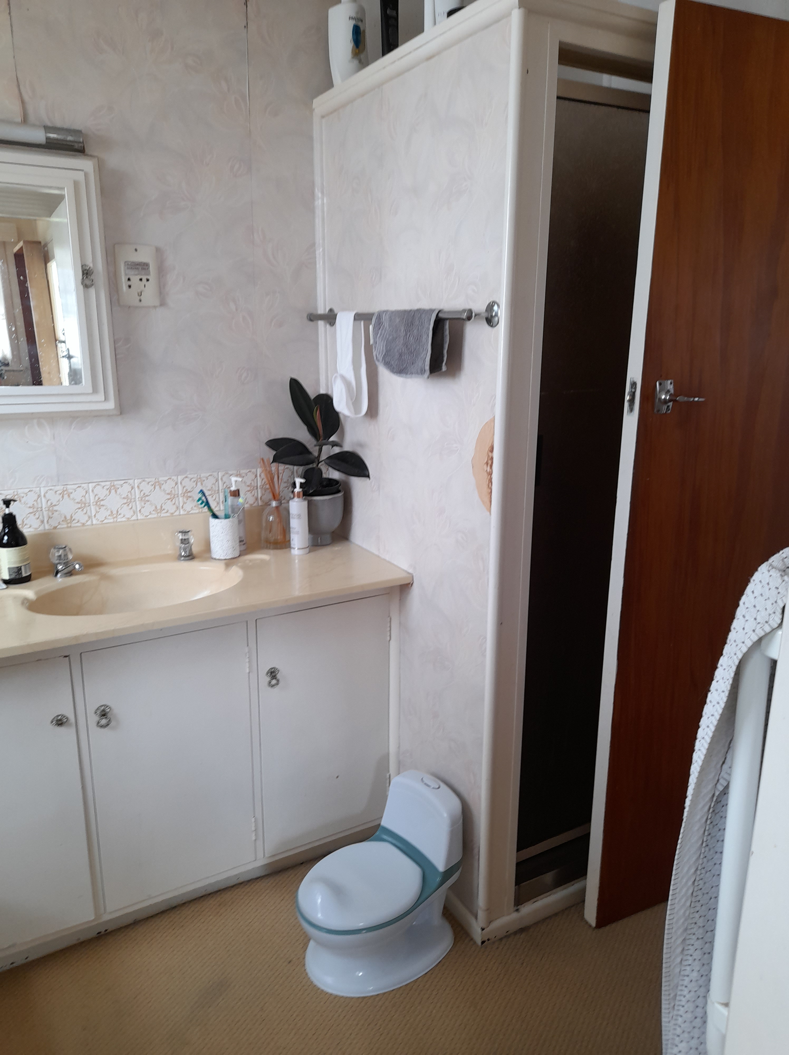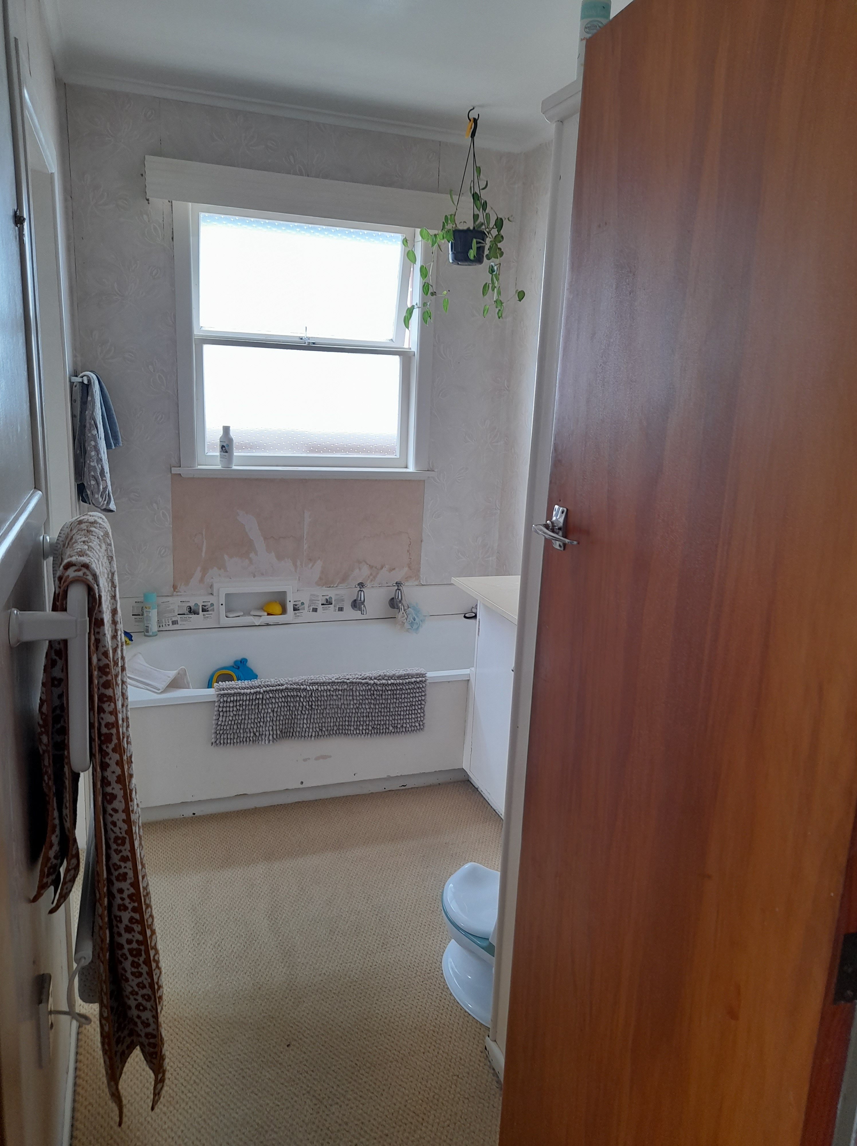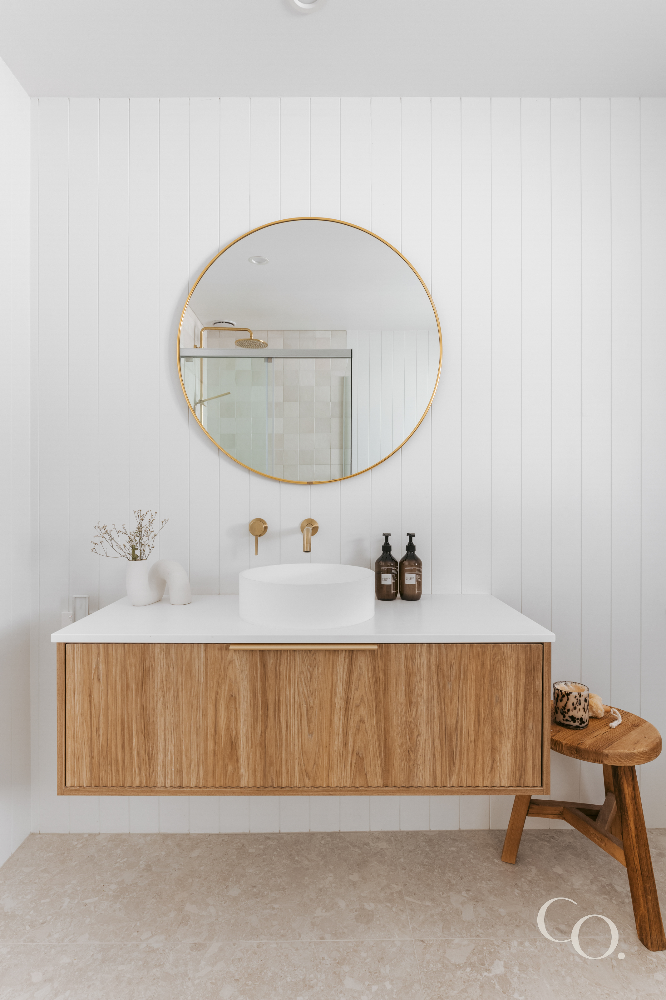 This busy young family of 4 needed a full bathroom refresh. Fresh white walls with neutral tones, brass and natural wood to bring in some warmth.