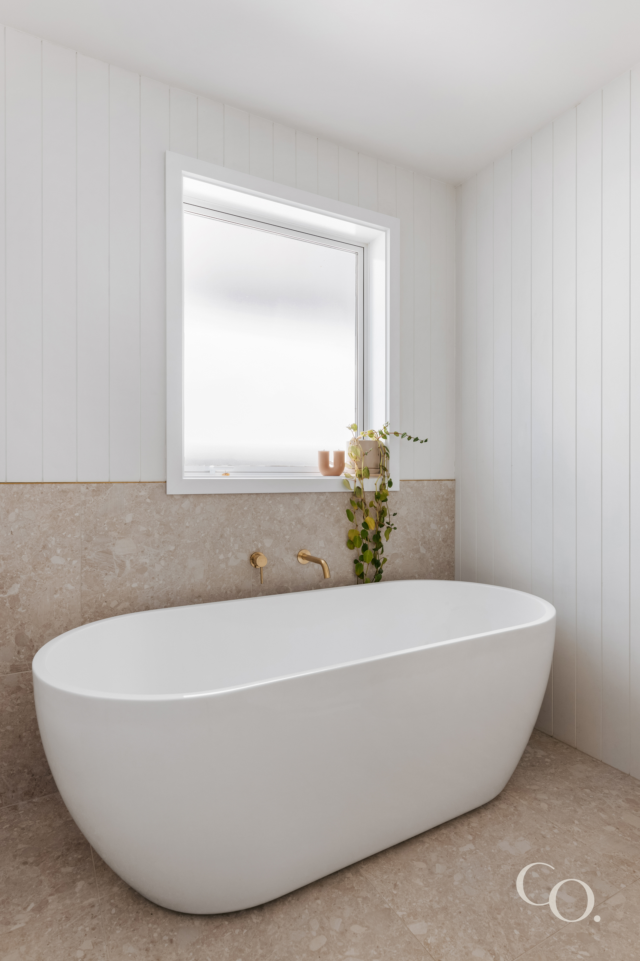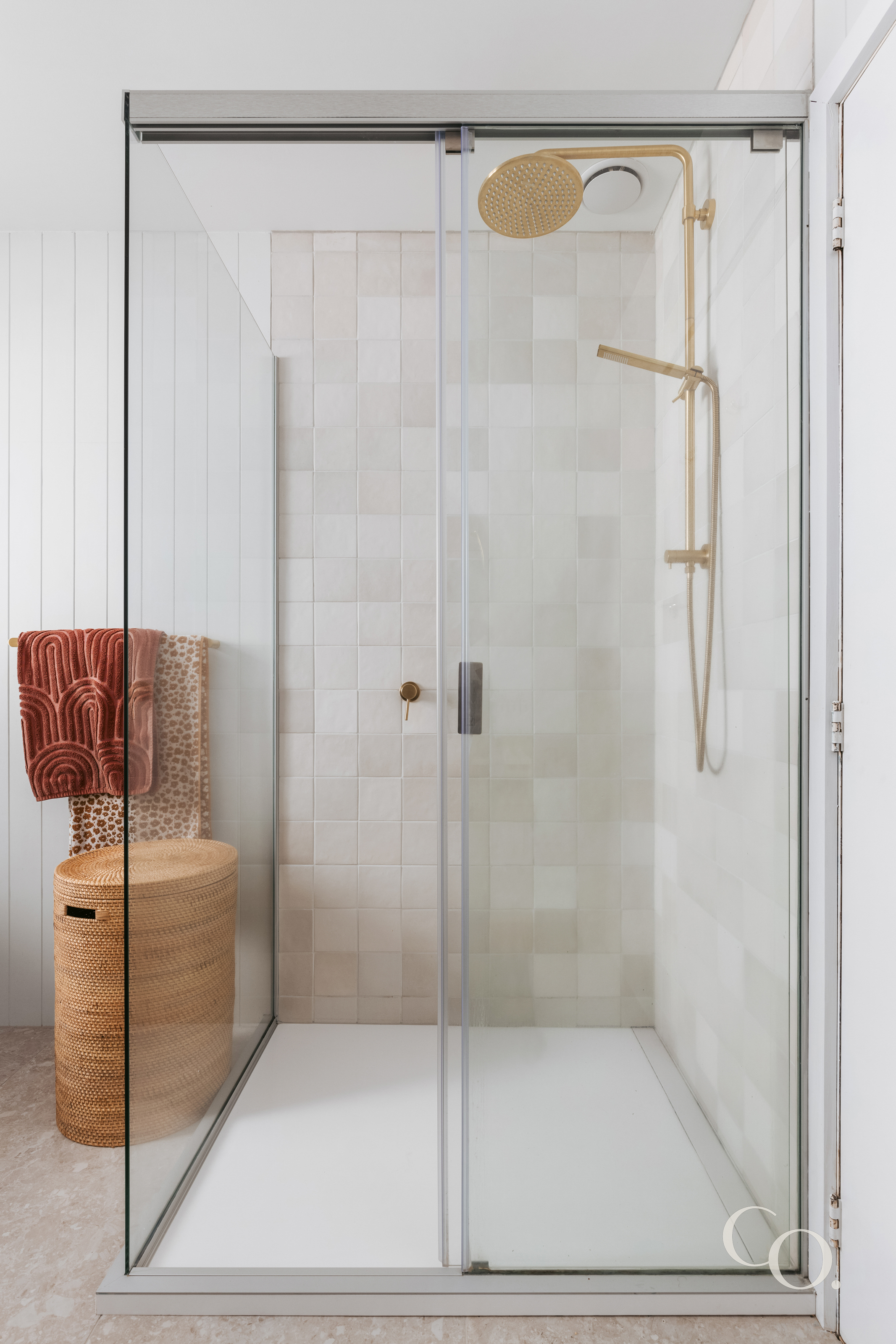 The brass details add that bit of luxe to this super family friendly bathroom. All these choices have a timeless character to them, allowing this bathroom to age with grace.