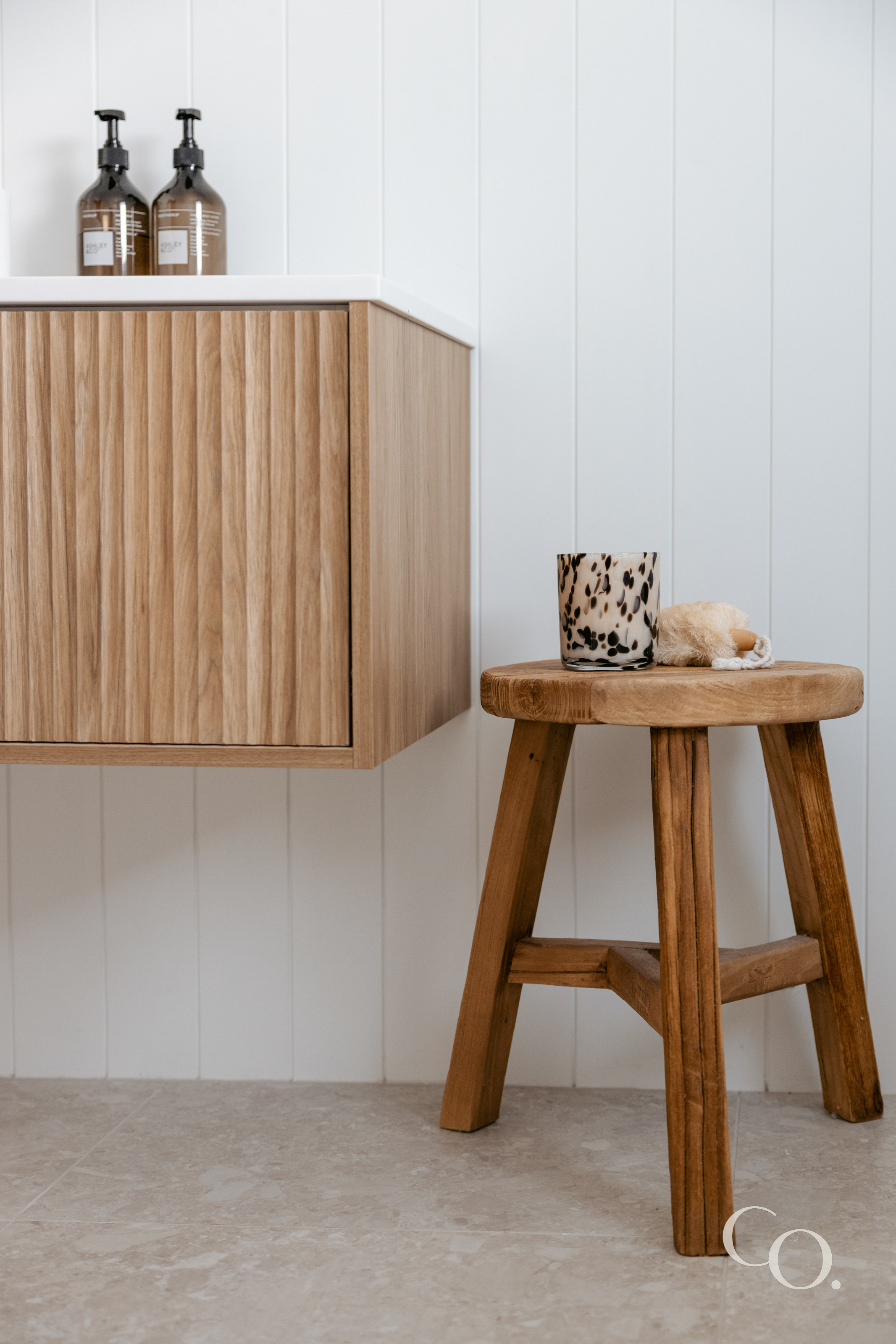 A floating vanity in oak giving the illusion of space, with a fluted front. More wood and rattan accessories to add a character and warmth to what can often be a cold space.