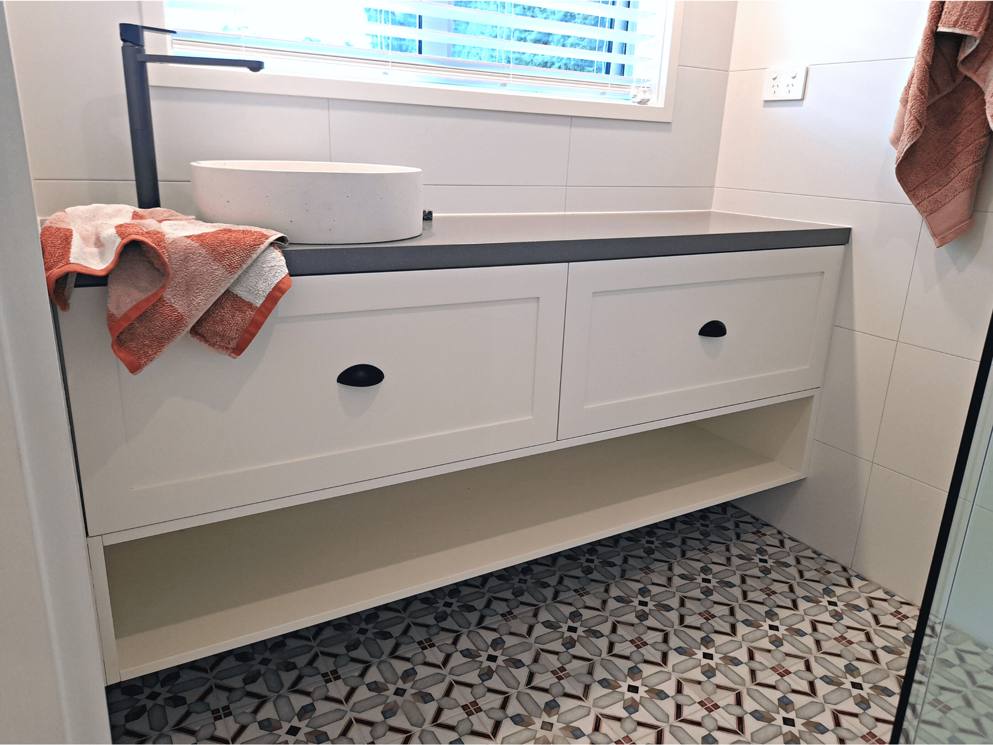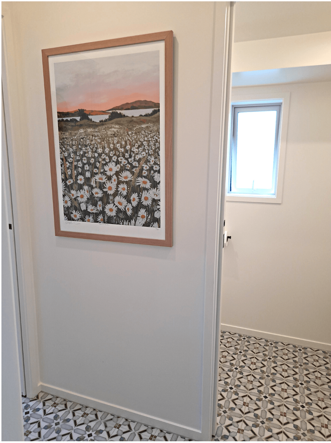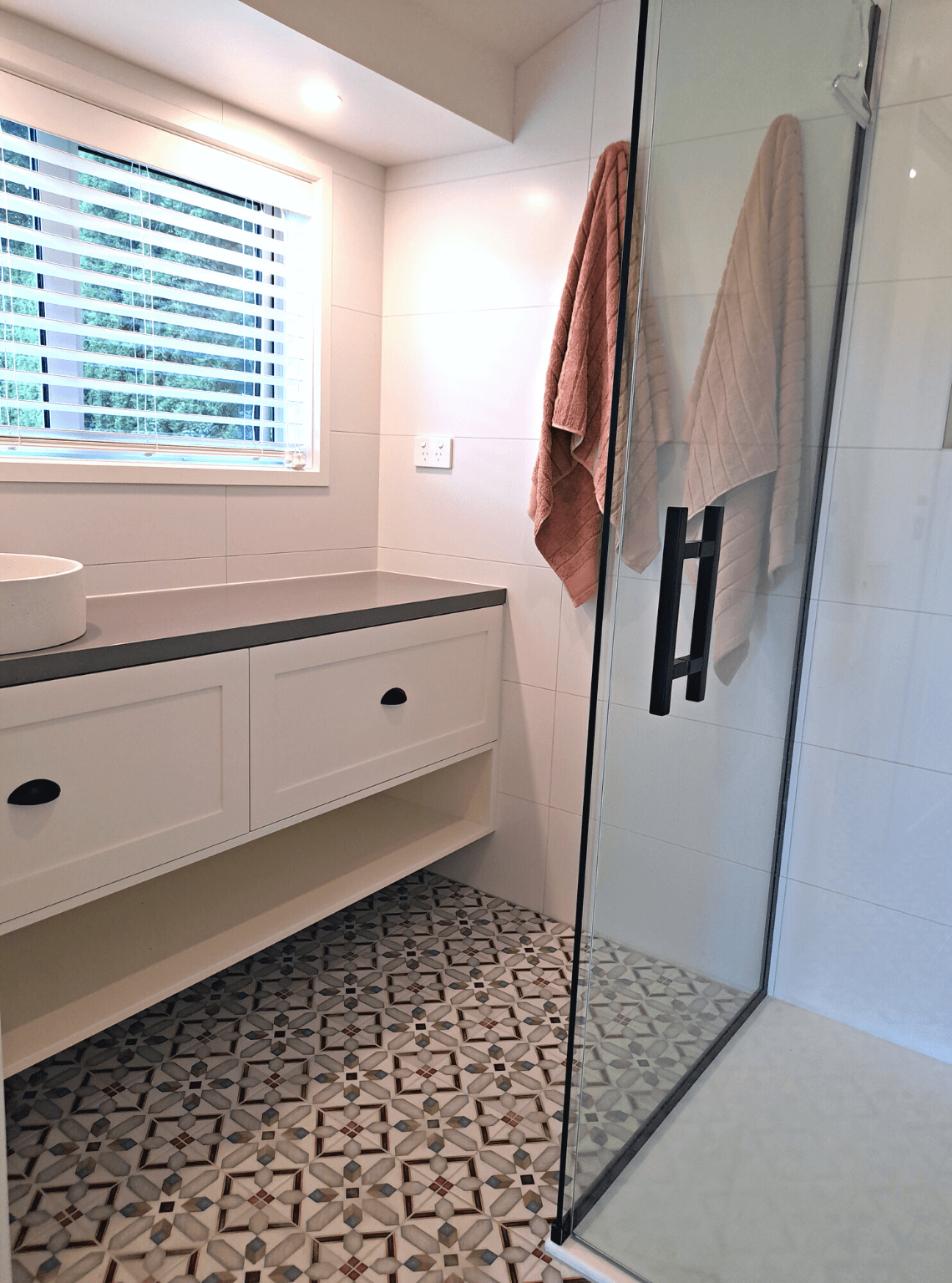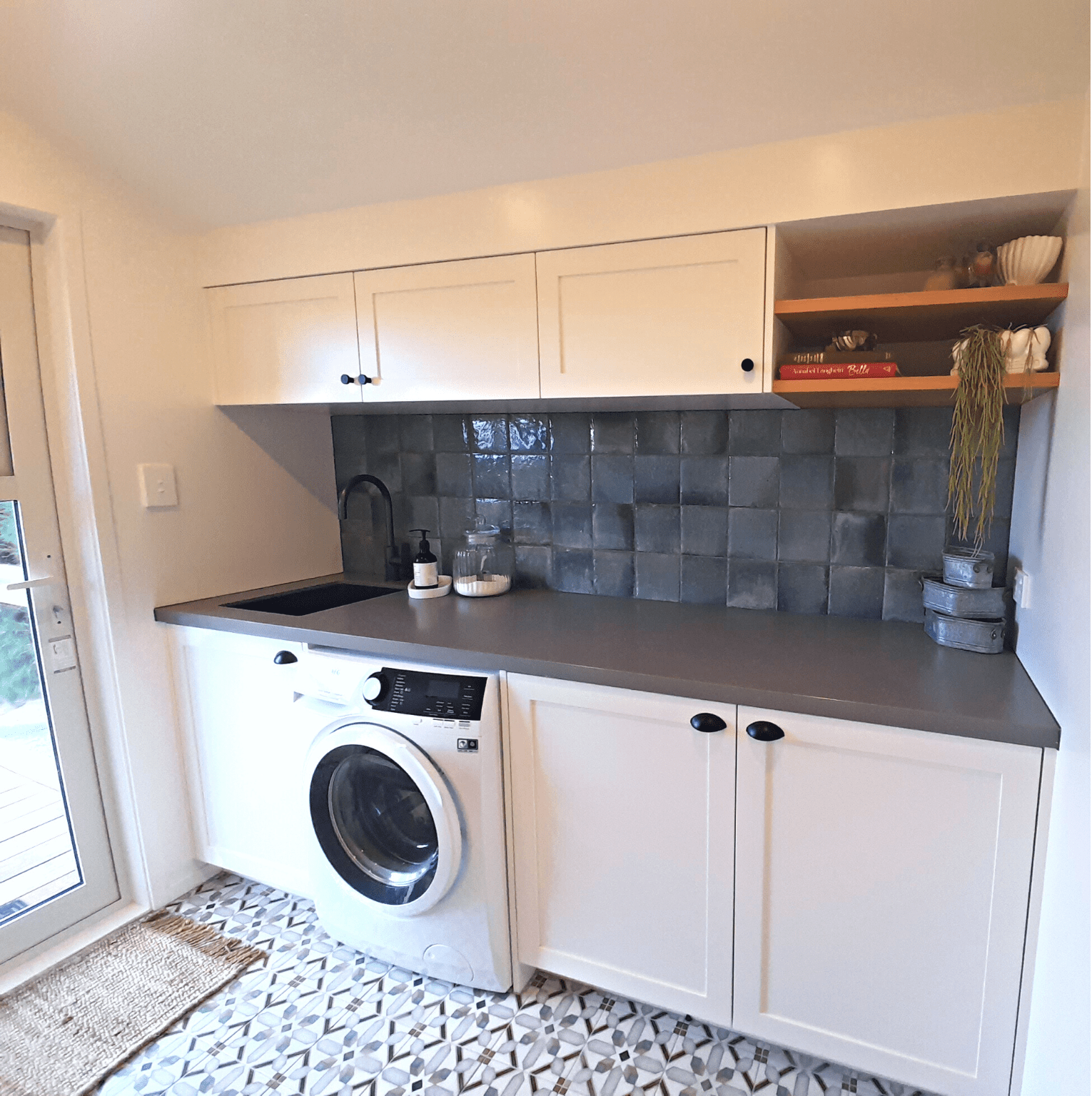 A bold patterned tile on the floor throughout this laundry/mudroom & bathroom areas. Beautiful classic colours which we pulled from in the splash for the laundry.