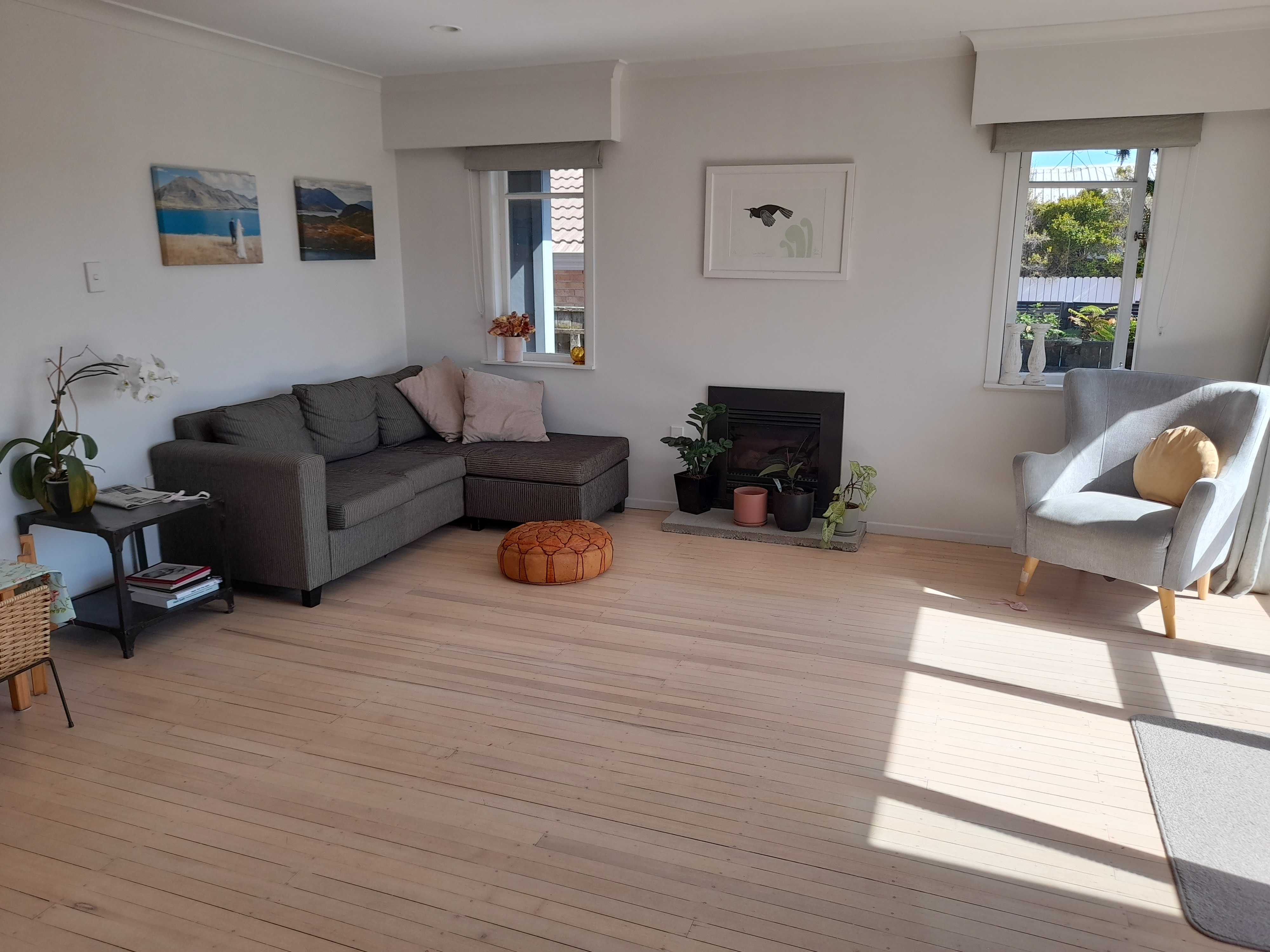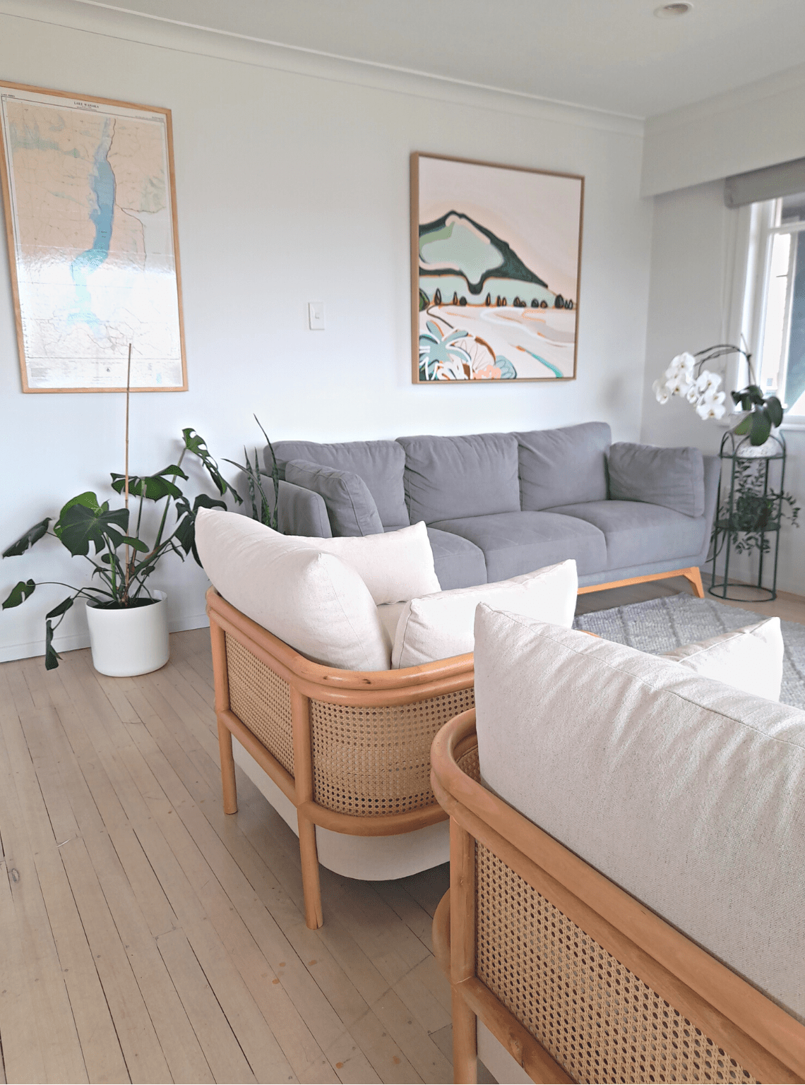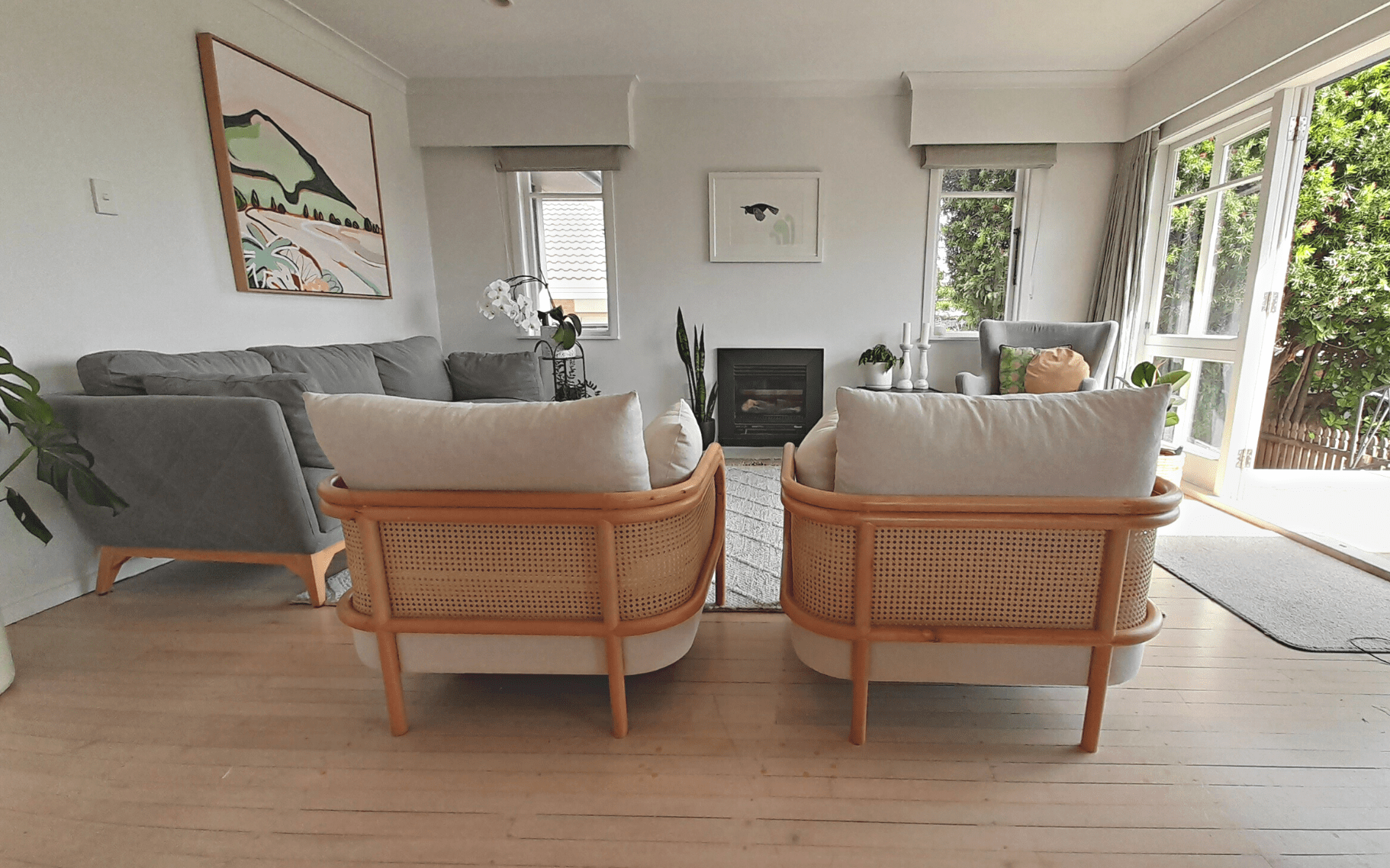 A palette of soft warm greys and creams with hints of blush pink, natural cane and accents of green plants. Adding a stunning piece of art to represent Mauao and the gorgeous beach here.