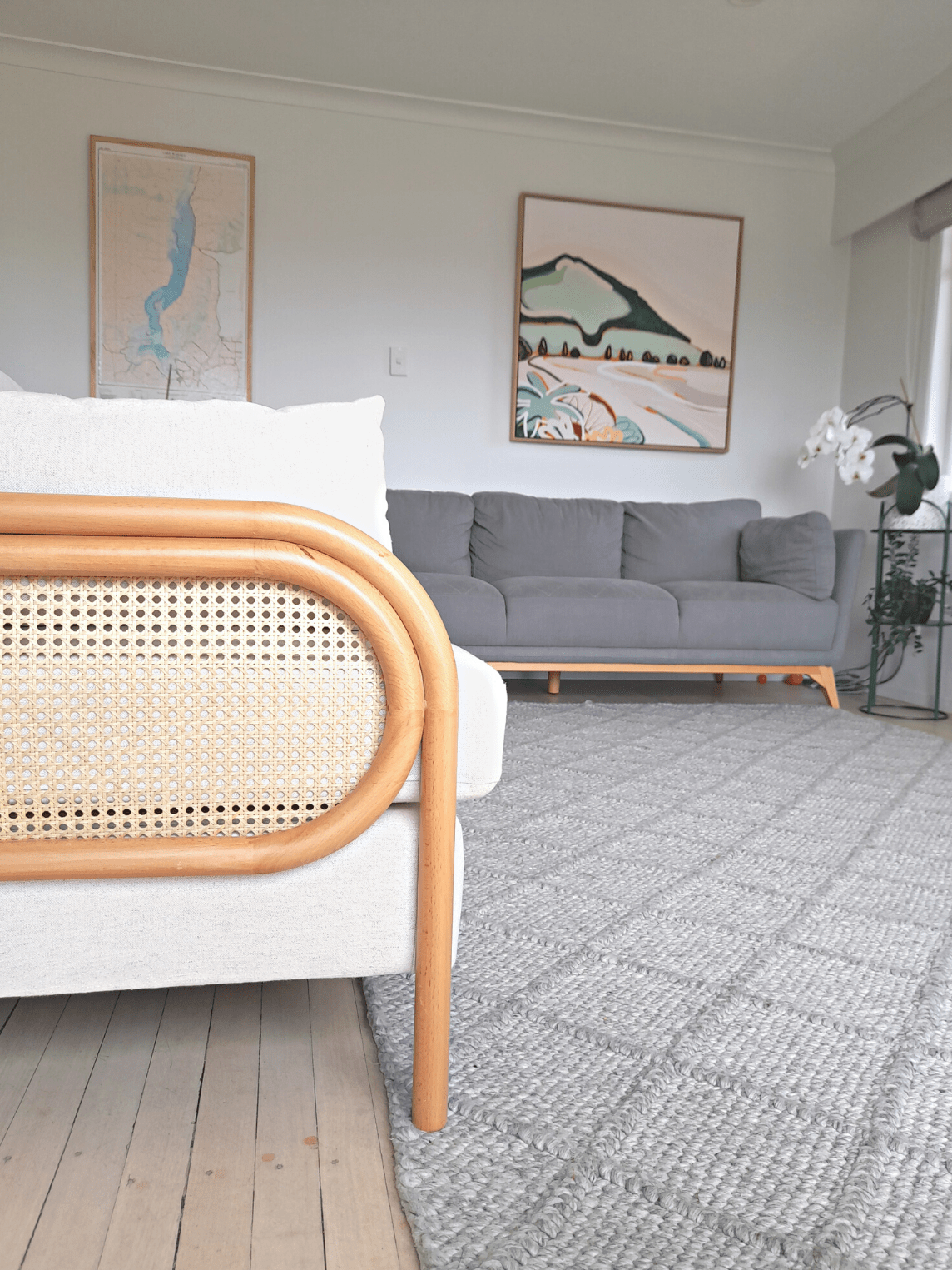 Keeping in tone with the beautiful white washed flooring. I added these amazing cane occasional chairs. A beautiful back was a must for these chairs, as this is your view from the Dining and Kitchen. Textural rug, anchoring the space.